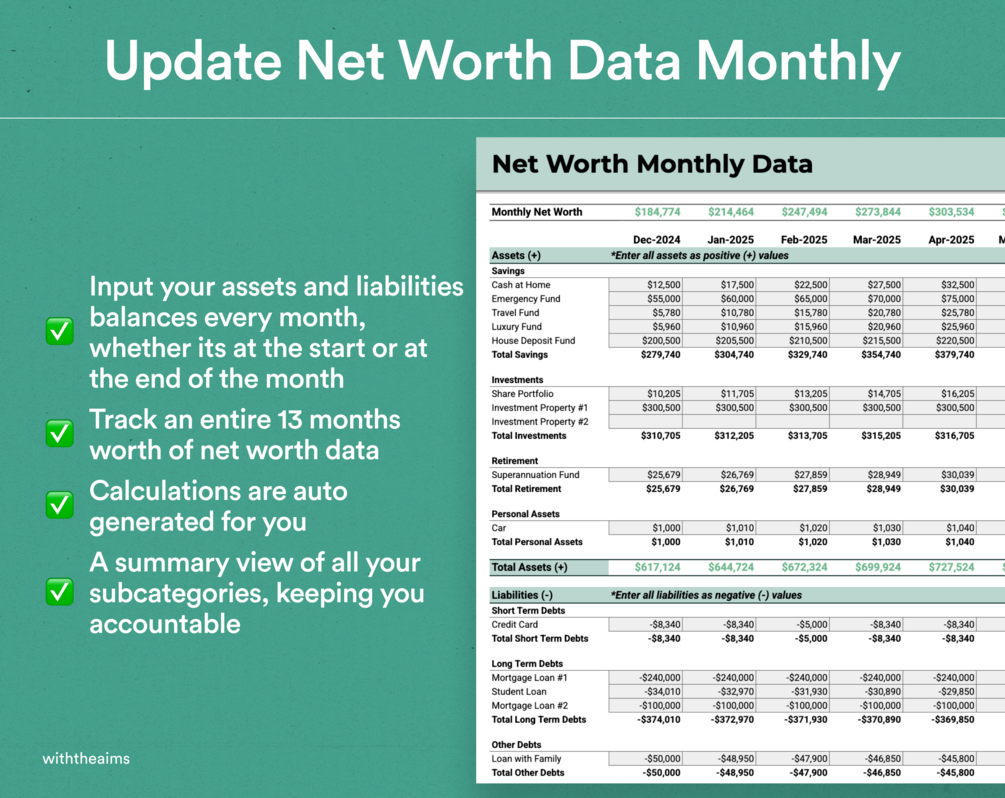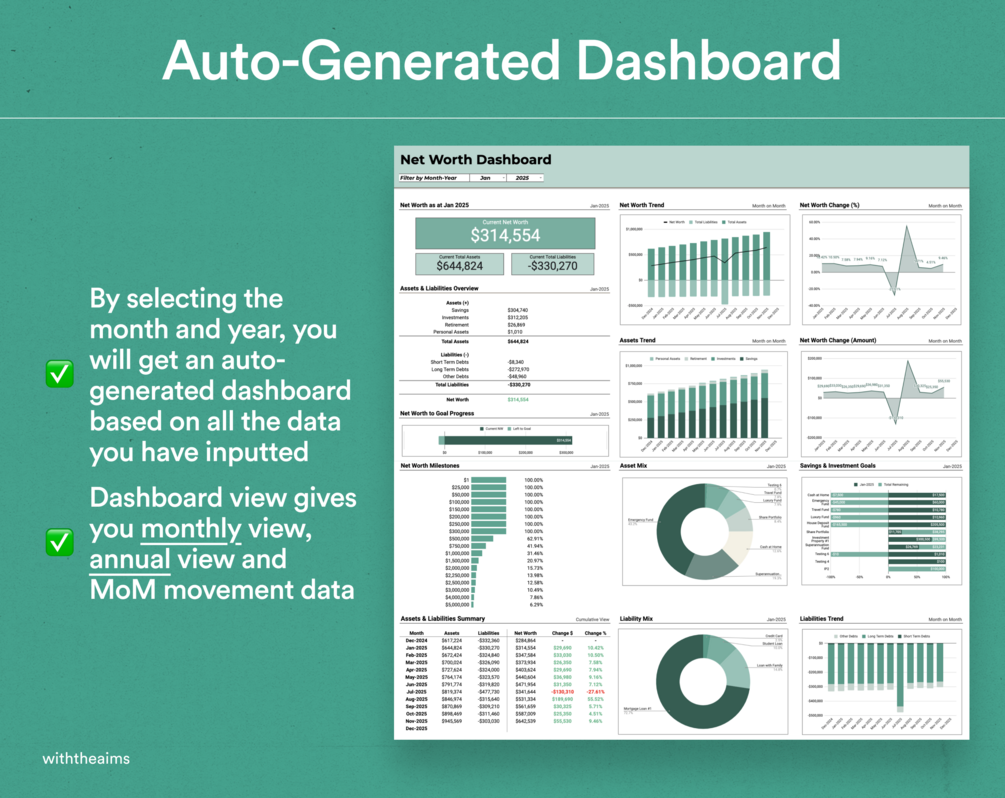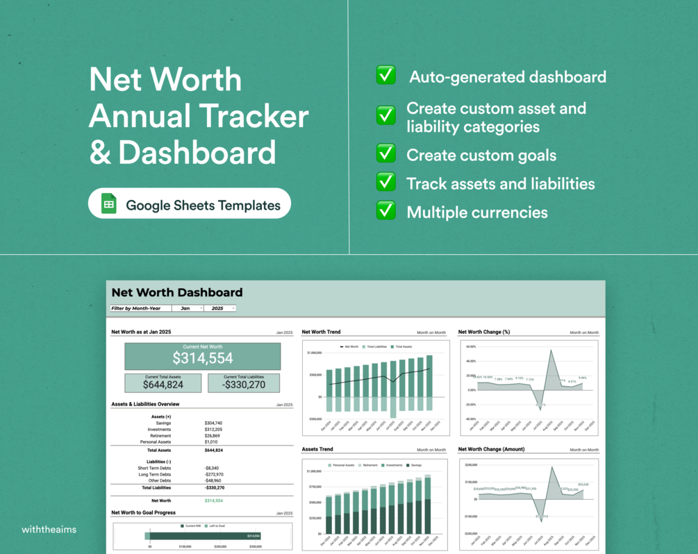 Net Worth Dashboard and Tracker in Google Sheets | Assets, Liabilities & Goals Tracking | Comprehensive | Annual