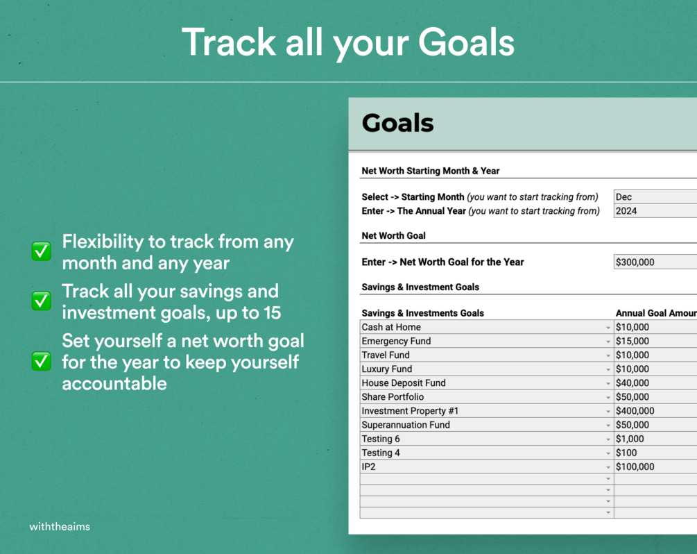 3. Input: Goals (Select the month you want to start tracking, input any annual year and enter all your goals)